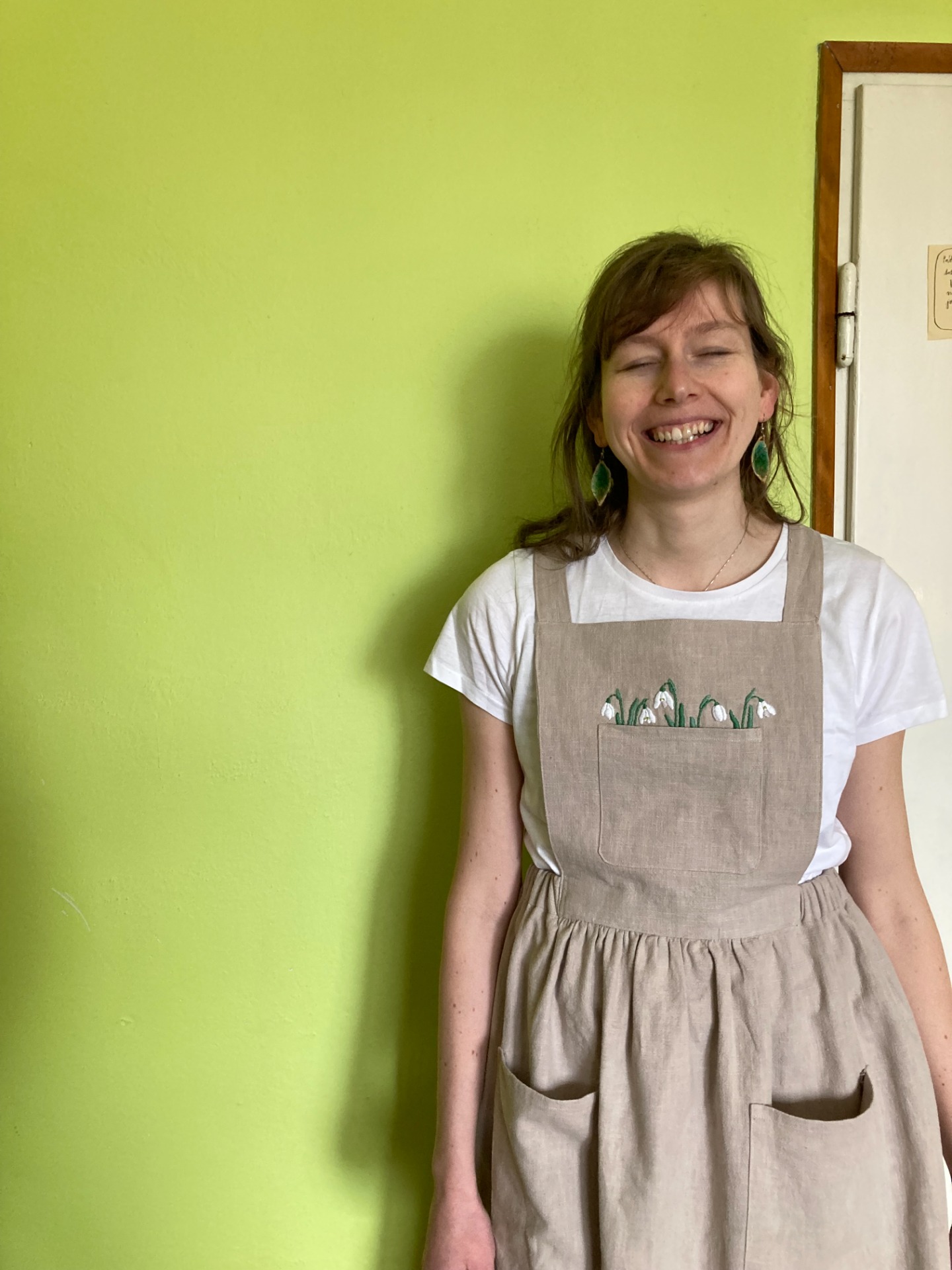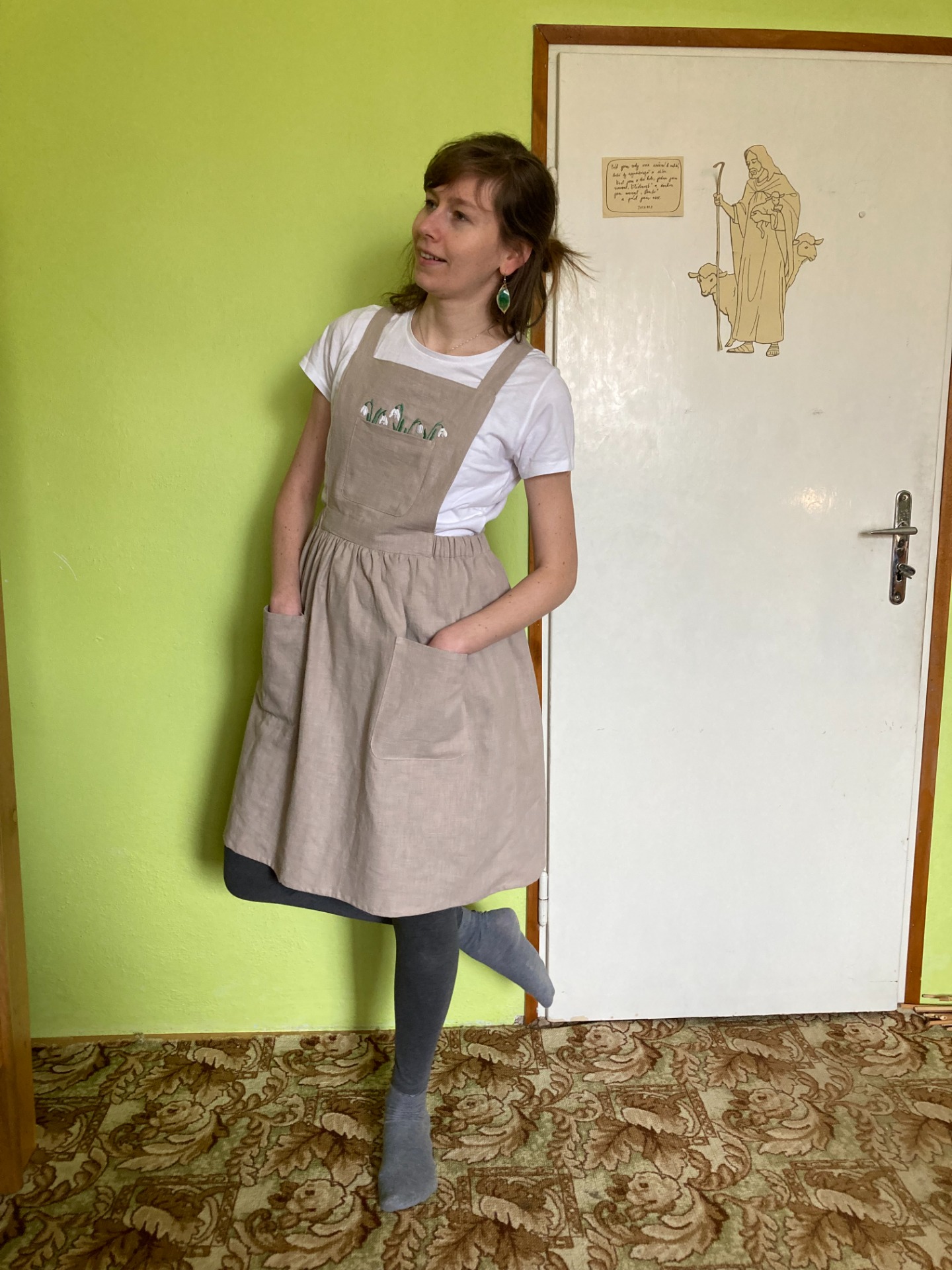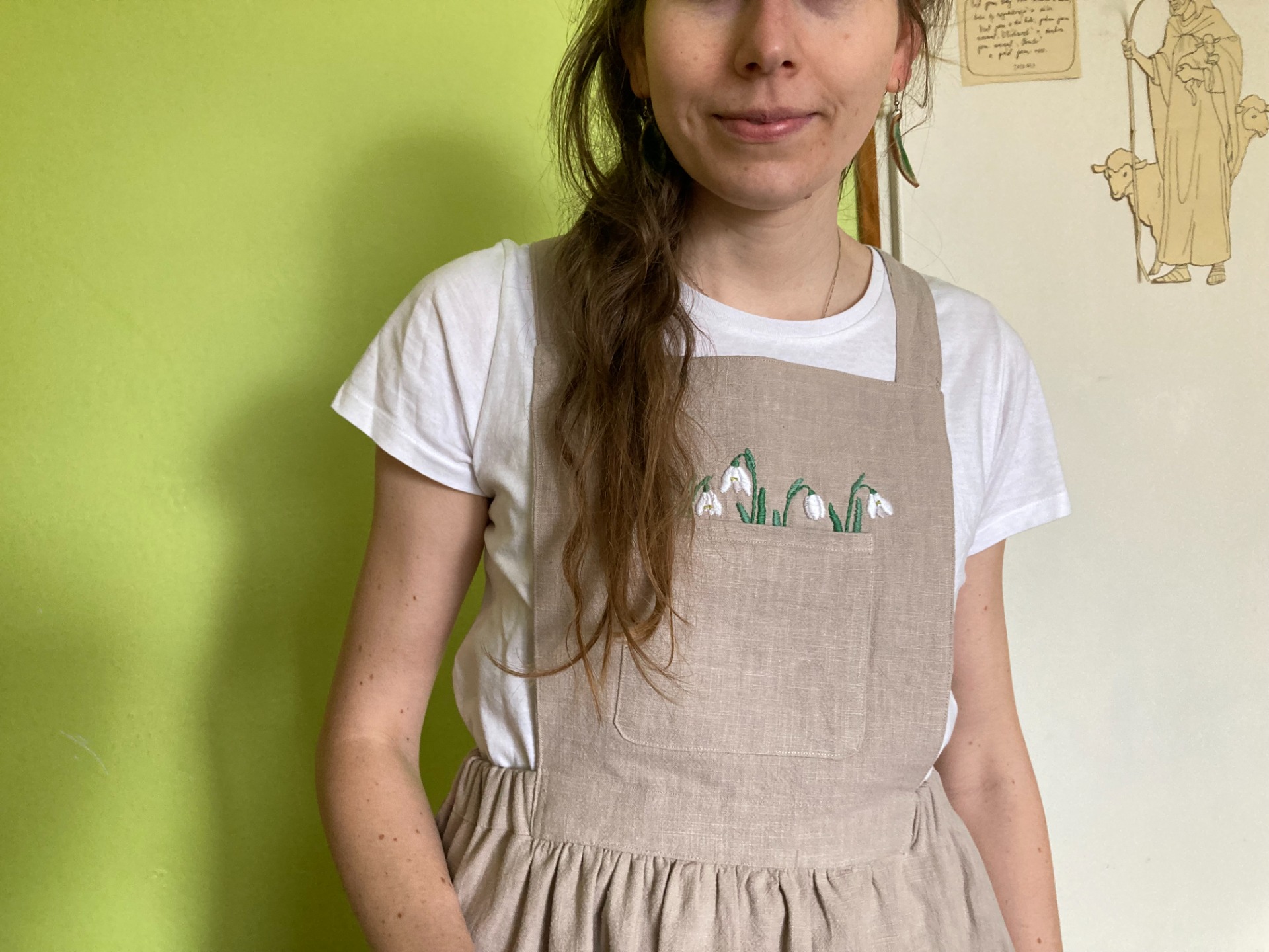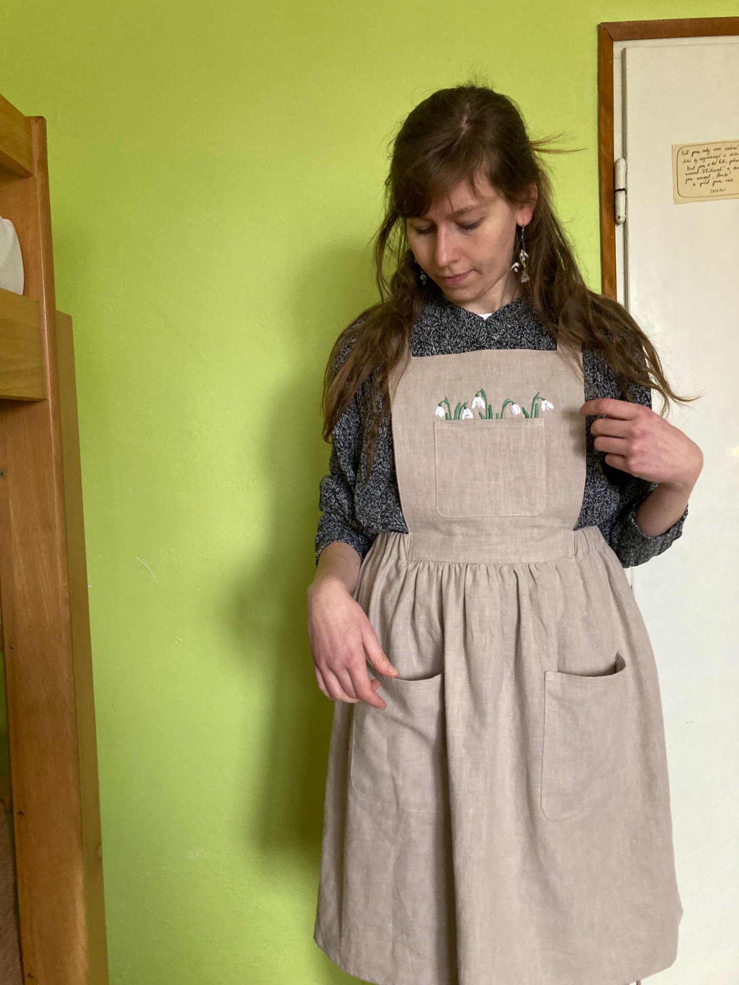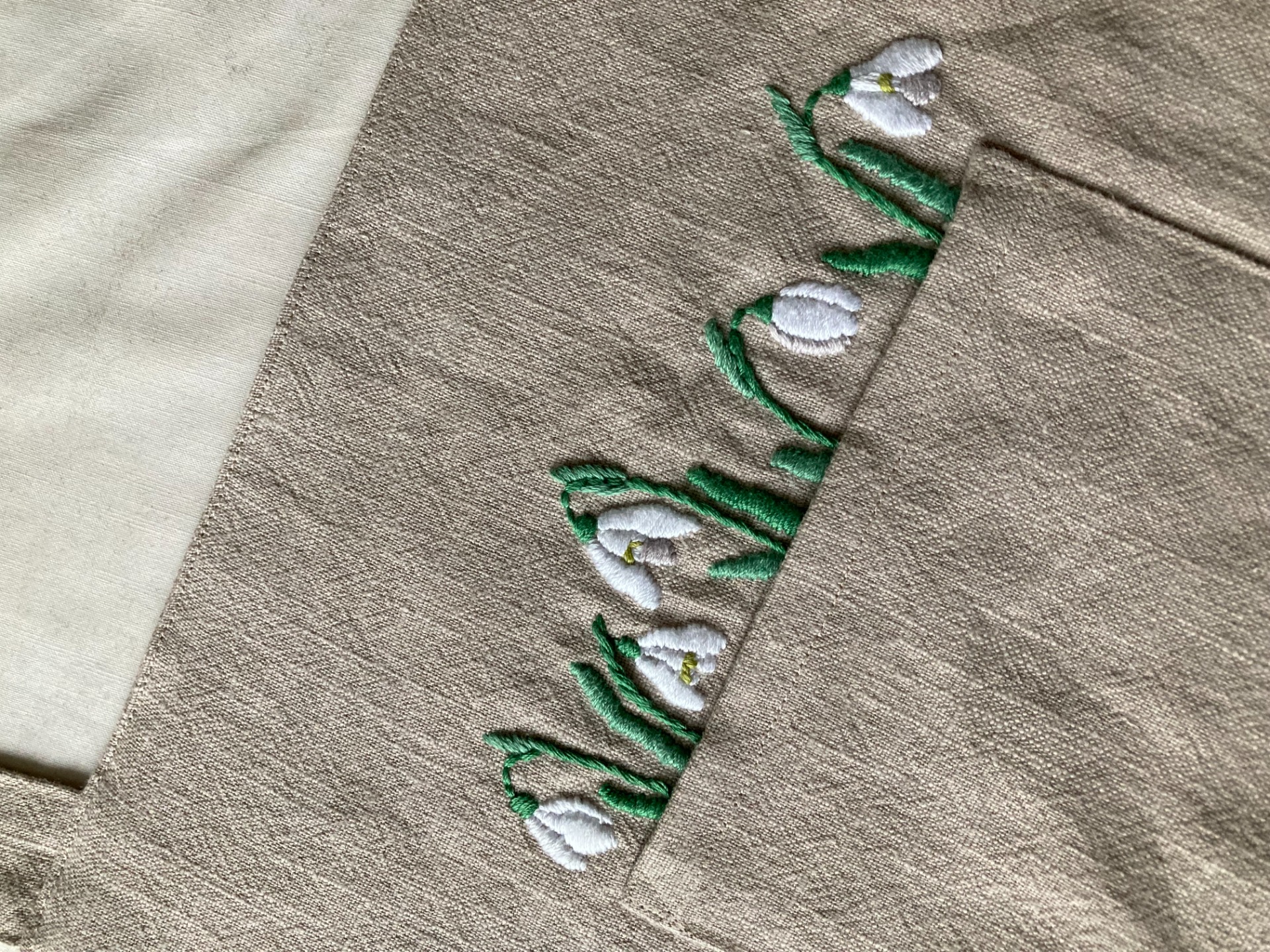 - z náprsní kapsy vyčuhují ručně vyšité sněženky