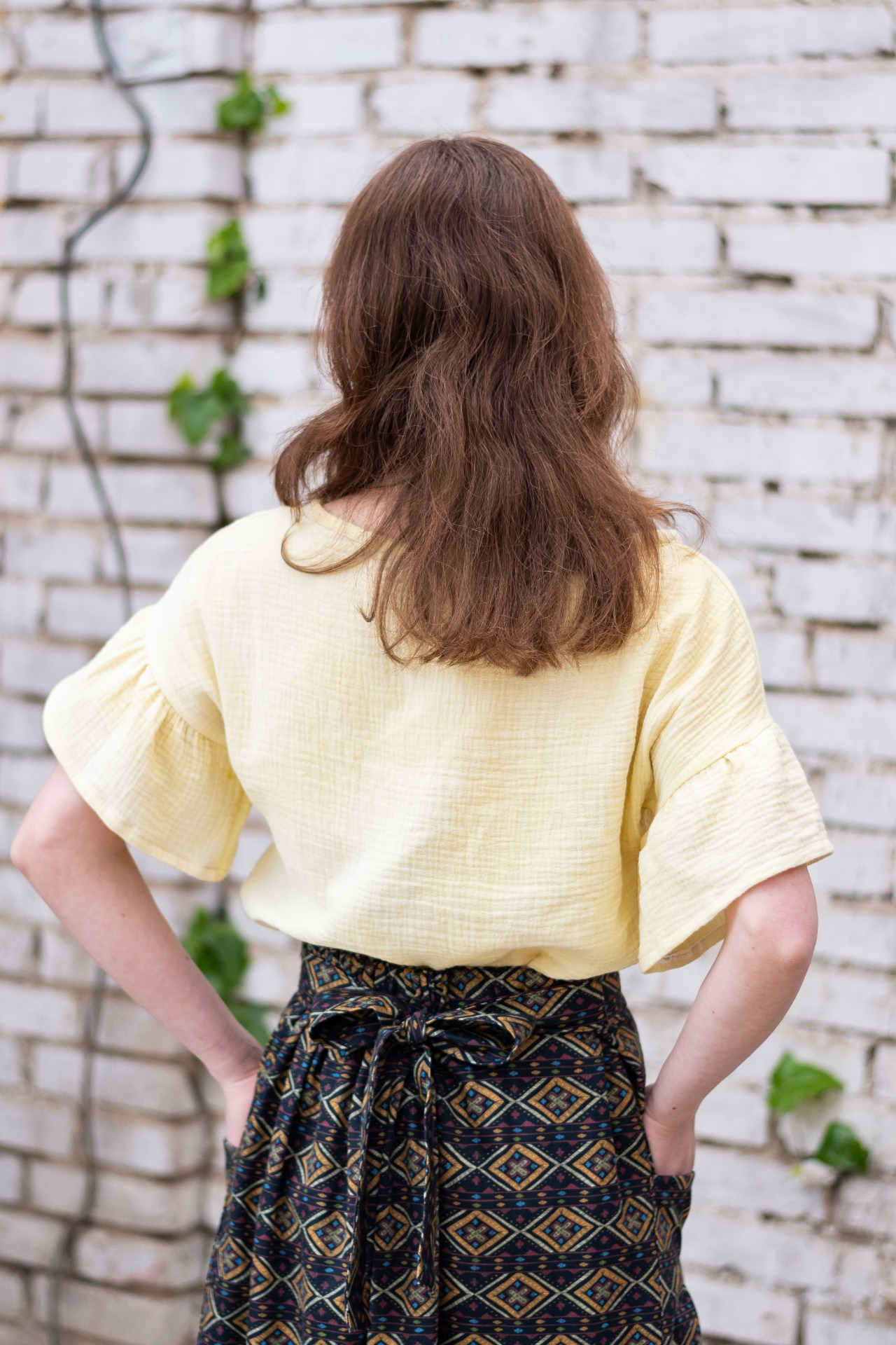 - halenka má široké nařasené rukávy, kulatý výstřih, který můžeš mít vepředu i vzadu