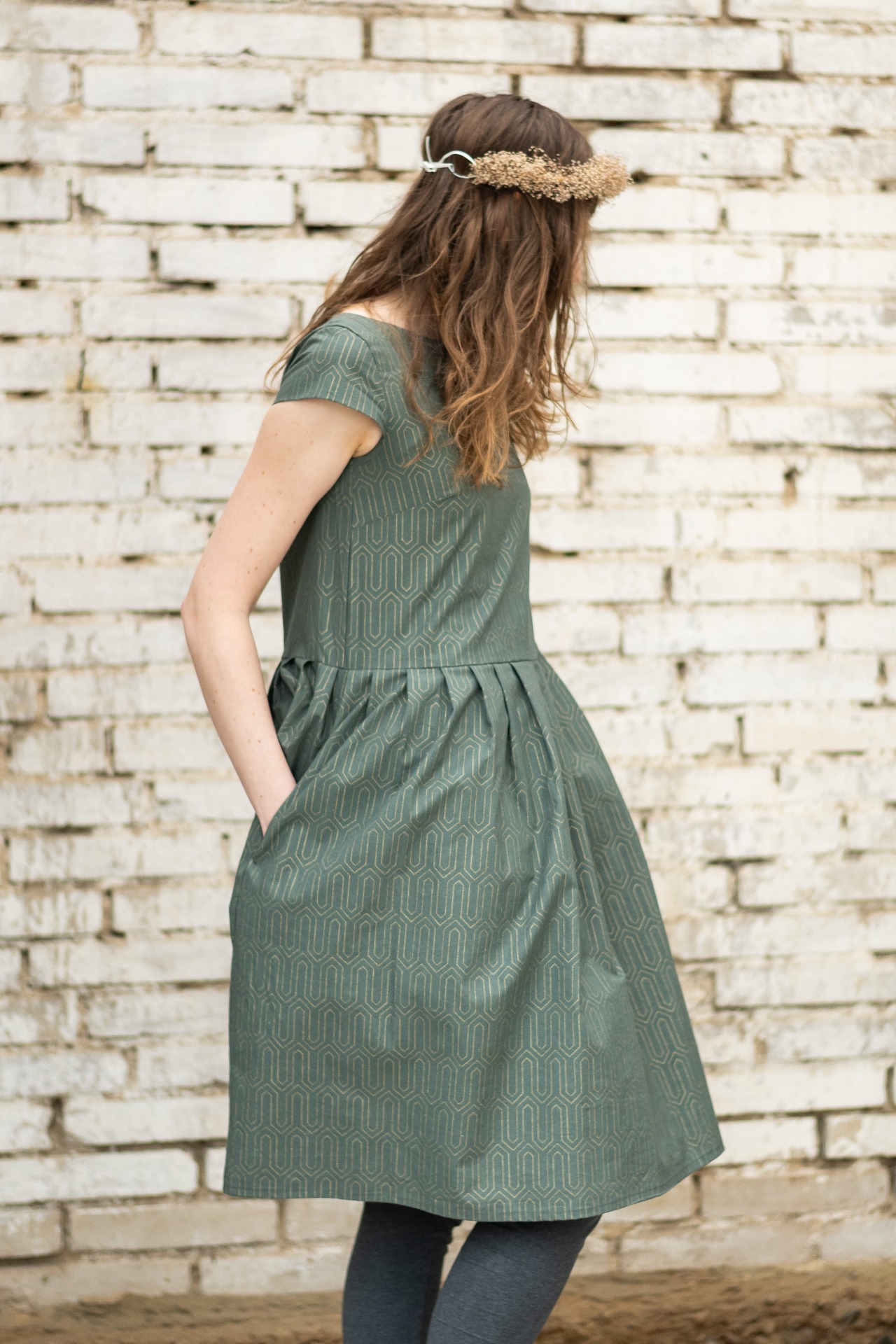 šaty z pevnějšího bavlněného plátna khaki barvy se zlatými lineárními ornamenty